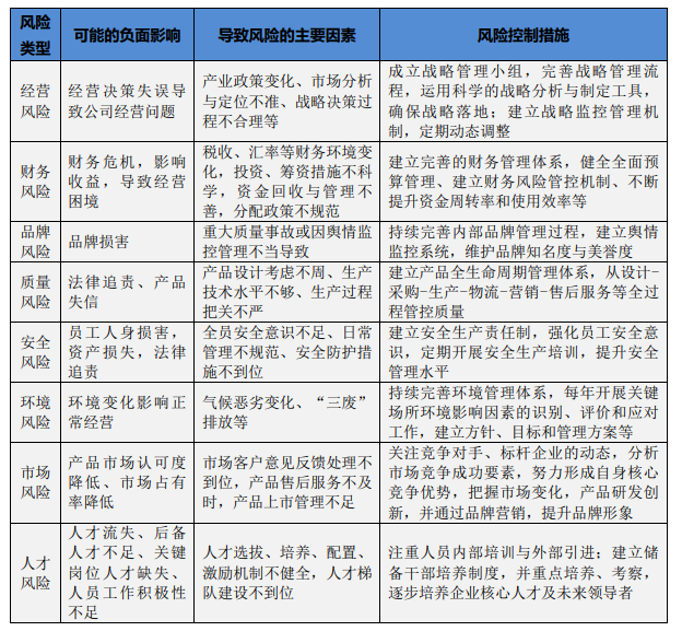 公司創(chuàng)立至今,在取得眾多成就的同時,不斷強化風(fēng)險意識,推動組織的持續(xù)經(jīng)營。為此,公司經(jīng)營管理團隊嚴格把控各部門工作中可能存在的風(fēng)險點,密切關(guān)注外部環(huán)境中的潛在風(fēng)險因素,積極采取風(fēng)險預(yù)防措施,在國家政策、市場需求、產(chǎn)品質(zhì)量、財務(wù)資金、運營管理等方面嚴格推行風(fēng)險監(jiān)測與保持風(fēng)險敏感性,高層領(lǐng)導(dǎo)不斷向公司各級員工灌輸風(fēng)險意識,強調(diào)市場競爭的殘酷性及環(huán)境的復(fù)雜性,最小化各種潛在風(fēng)險對公司的影響。在內(nèi)部運營風(fēng)險管理方面,公司對主要內(nèi)部運營風(fēng)險評價指標進行識別并采取預(yù)防措施,如財務(wù)管理每年定期對應(yīng)收賬款進行動態(tài)跟蹤與管理,防范呆賬和壞賬風(fēng)險。